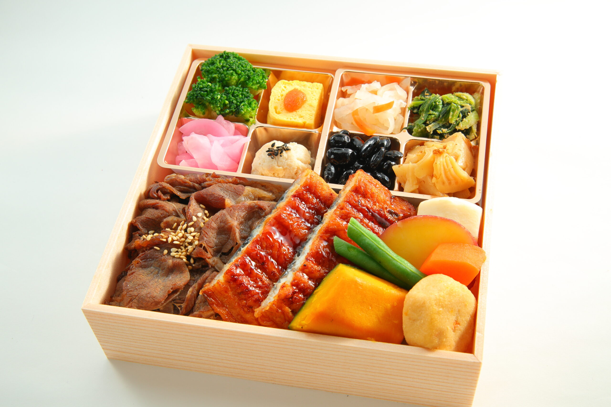 特製の甘辛い煮汁でじっくりと煮込んだ和牛肉と、ふっくらと焼き上げたうなぎが贅沢に盛り合わせられたお弁当です。和牛肉の柔らかさとうなぎの香ばしい風味が、口の中で絶妙に調和します。