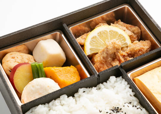 百年の手焼き京のだし巻き/鶏ももの唐揚げ/レモン/京風煮物盛合わせ/(がんも・六角小芋・しんじょう・南瓜・薩摩芋・インゲン豆)/ご飯[約180g]/小梅/黒ゴマ